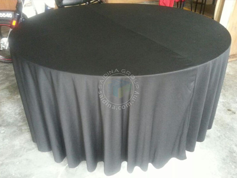 Alas meja bulat jenis ini digunakan sebagai alas meja asas dengan kain PQ yang tebal dan labuh 3 kaki ke bawah. Ianya sangat cantik untuk majlis perkahwinan atau sebarang majlis rasmi.