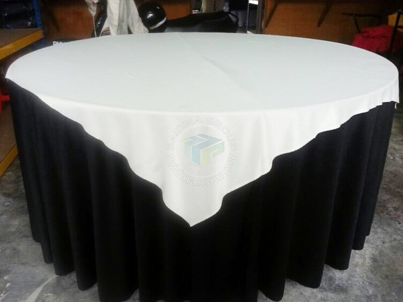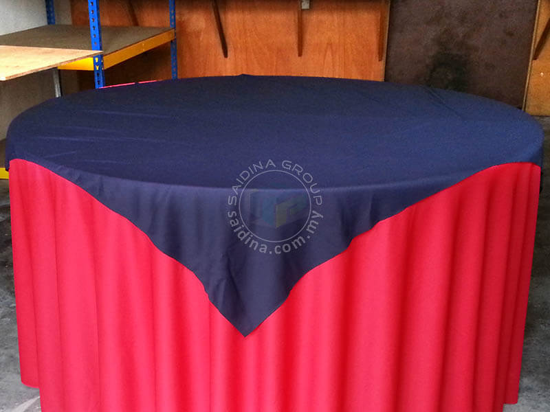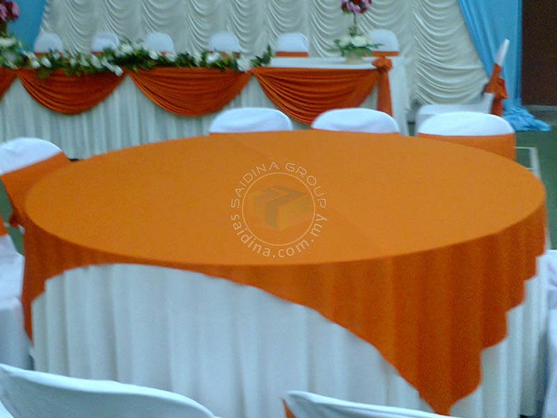 Alas meja berwarna ini diletakkan di atas alas meja bulat asas menjadikannya lebih cantik dengan warna pilihan mengikut warna tema majlis.